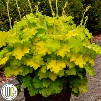 Staude. Lyse blomster fra midtsommer. Gule til limegrønne blade. Placeret i skygge opleves limegrønne blade, og mere gule i halvskygge. Højde ca.25cm. Bredde ca.70cm. Velegnet til krukke og i havens bede. God i buketter. Tiltrækker sommerfugle og humlebier. Bivenlig.