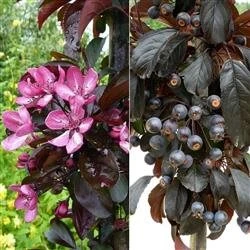 grene.Træet bliver op til ca. 3 meter. Smukt skinnende mørkerøde løv, der senere bliver grønt – rødt. Blomstrer i maj med purpurrosa blomster og giver små sortrøde paradisæbler på ca. 1 – 2 cm. størrelse. En god og sund sort, fundet i Danmark.